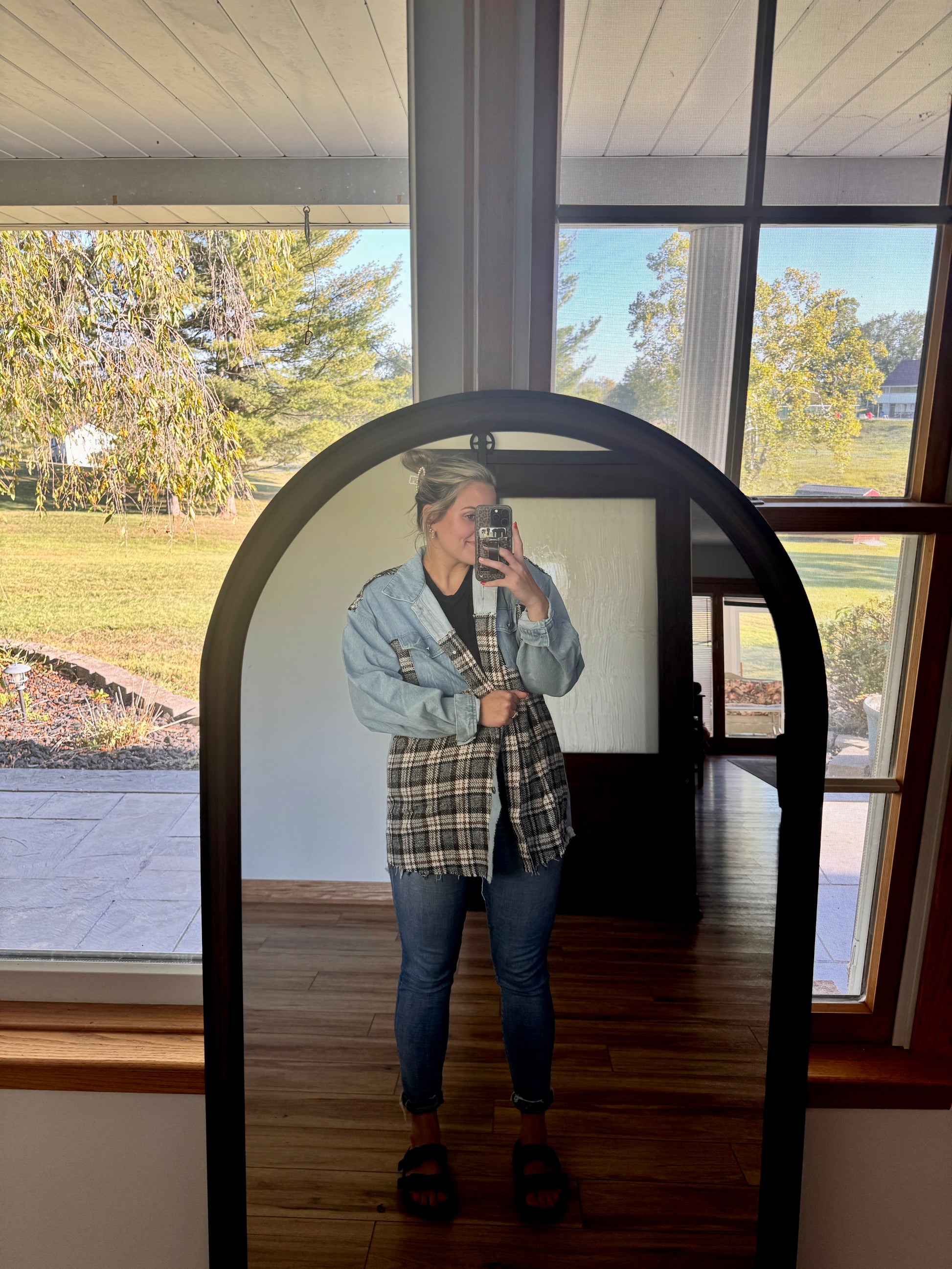 Cozy meets cool in this Denim & Plaid Patchwork Shacket. Featuring a soft plaid front with raw hem detailing and contrasting denim sleeves + back, this piece is the perfect mix of casual and trendy. Easy to layer over your favorite tee or sweater, it’s a go-to for bonfires, errands, or cozy fall days.